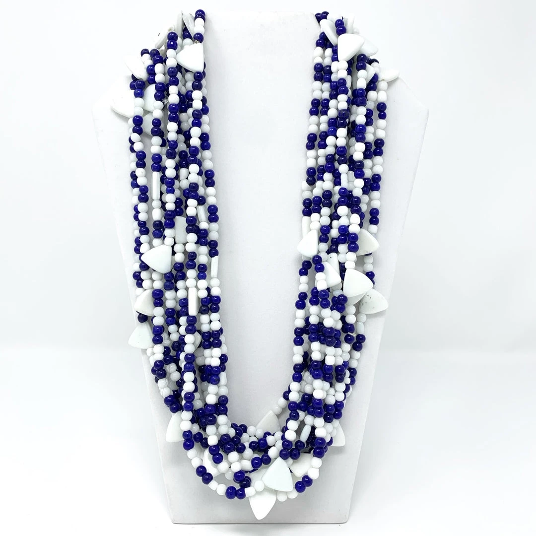 Be the first to review “Mardi Gras Spot 27″ Blue And White With White Triangles Glass Bead Necklace (Dozen)” Cancel reply