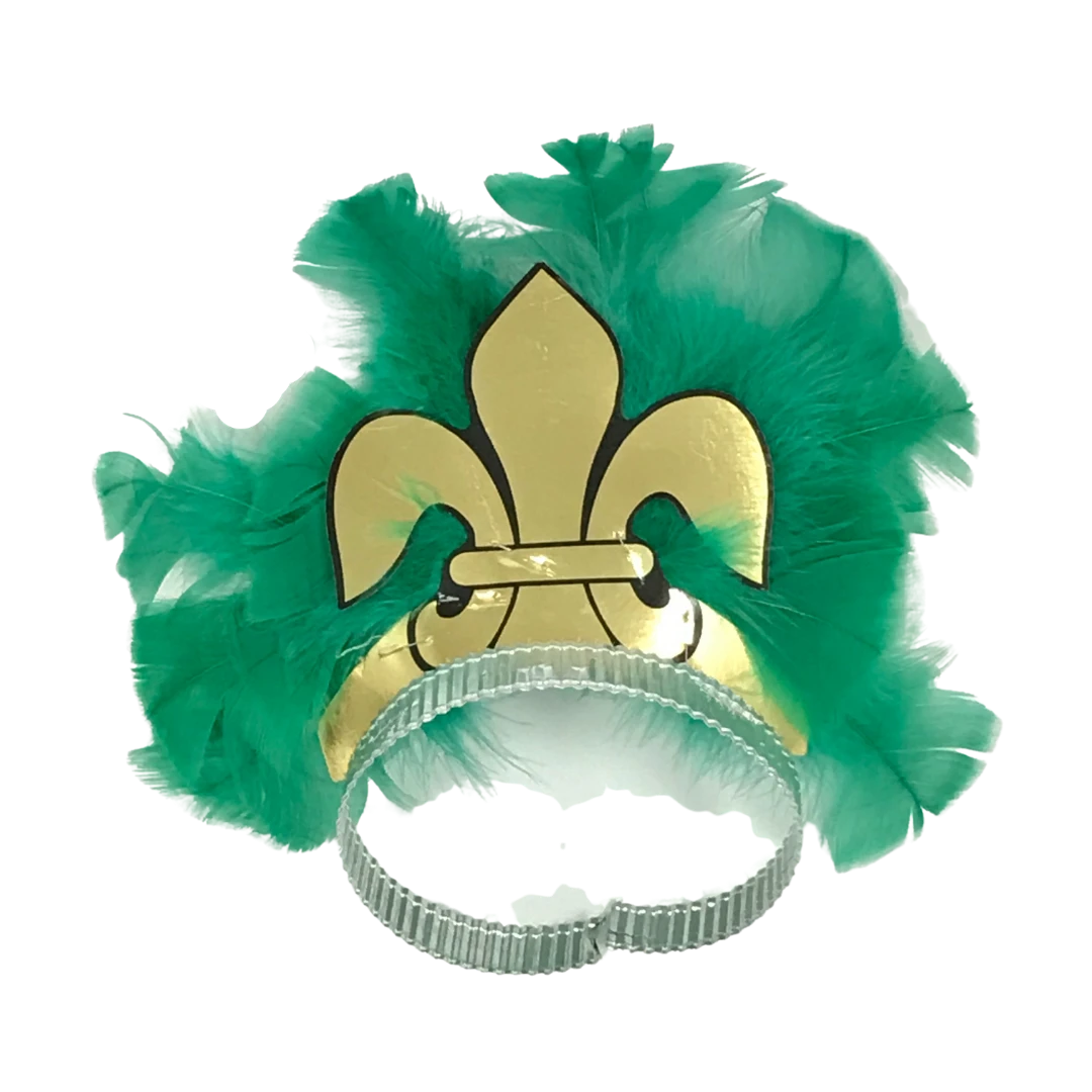 This headband features a silver wired base for shaping on the head, a fleur de lis decoration and green or purple feathers on top. Perfect for celebrating Mardi Gras (Fat Tuesday)!