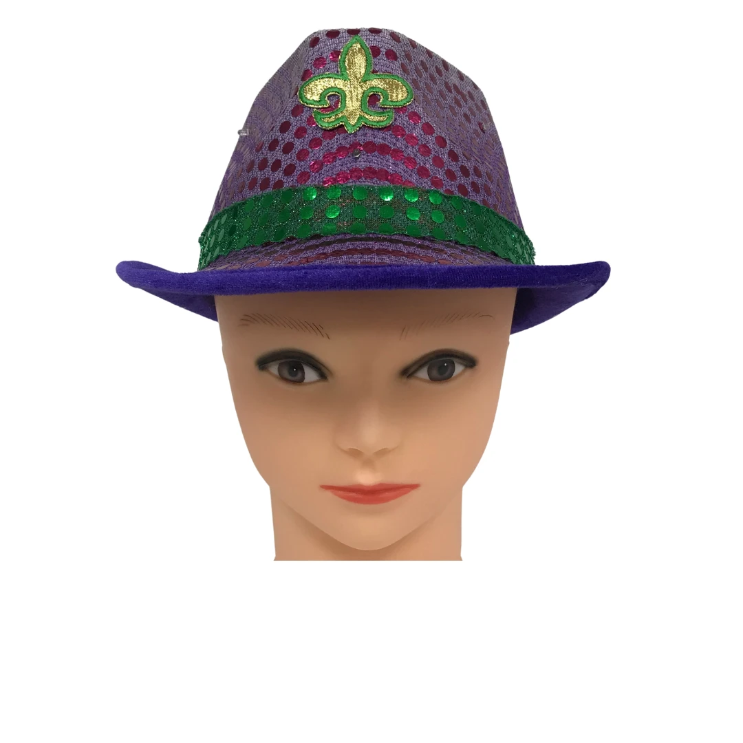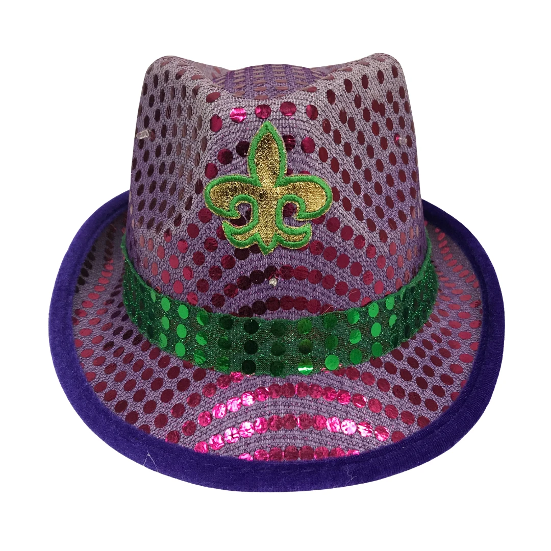 LED Purple and Green Sequin Fedora with Gold Fleur de Lis (Each)