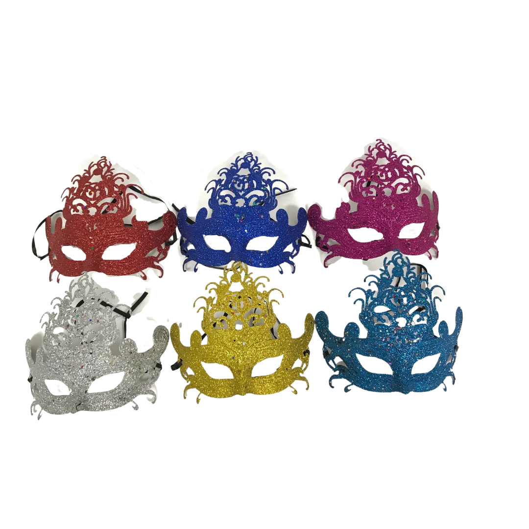 • This costume accessory half-face mask features an ornate glitter design in various colors.