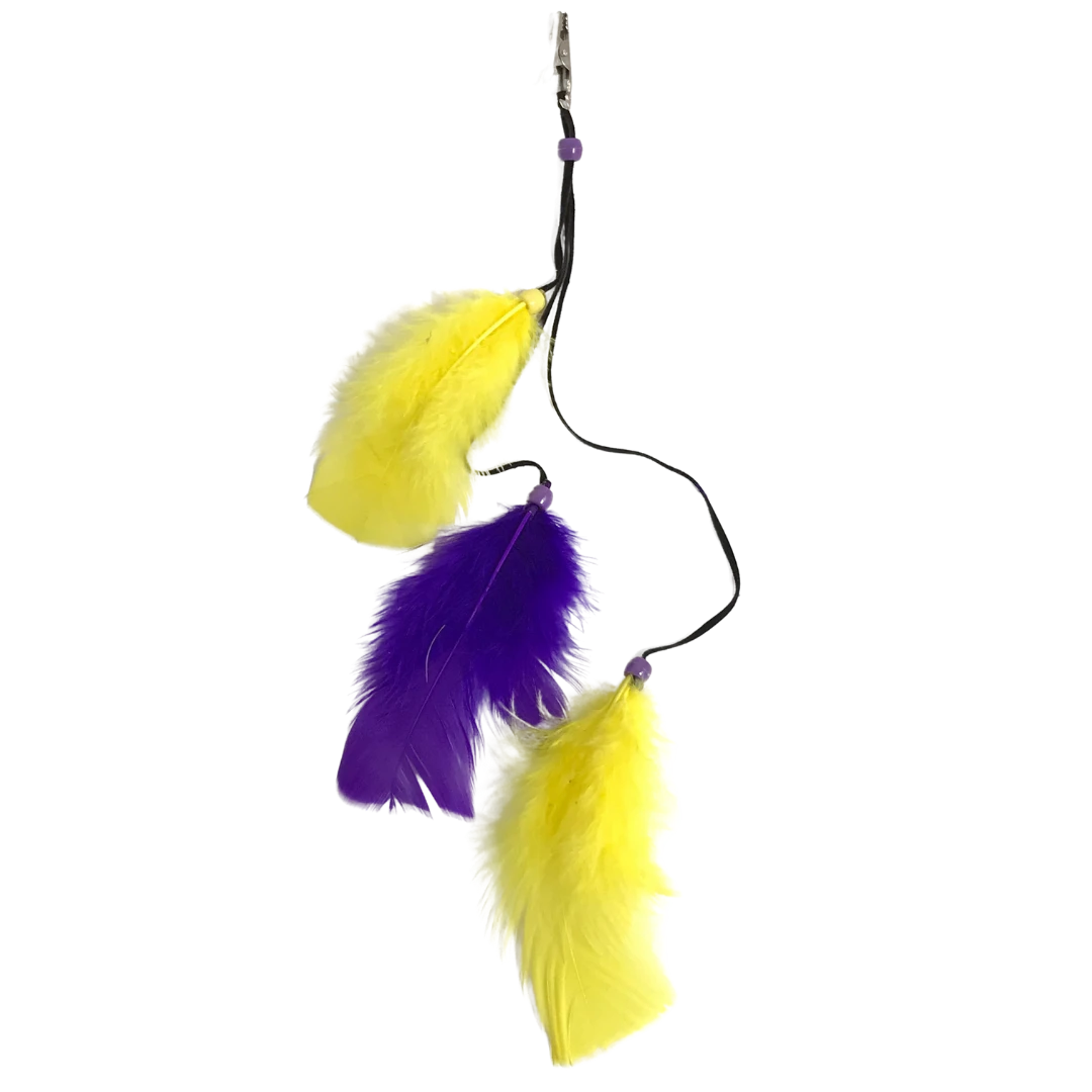 Glamorize your hair or clothes with colorful feather clips! Each clip has three feathers in purple and yellow (gold) colors. Perfect for showing your team spirit or any other costuming or dress up occasion