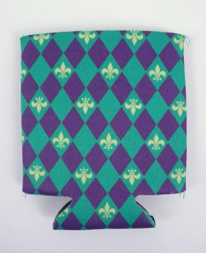 Purple Green and Yellow Harlequin Coozie with Fleur de Lis with Header Card (Each)
