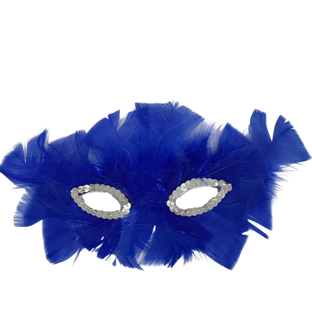 • This costume accessory half-face mask features a royal blue feather design with silver sequins around the eyes