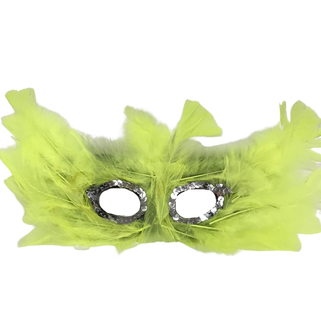 • This costume accessory half-face mask features neon yellow feathers with silver sequins around the eyes