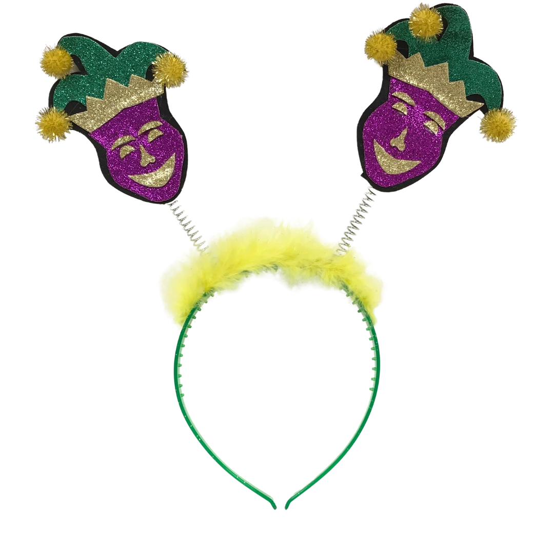 Make a statement with the masks of comedy, true symbols of Mardi Gras, when you wear this festive purple, green, and gold headband!