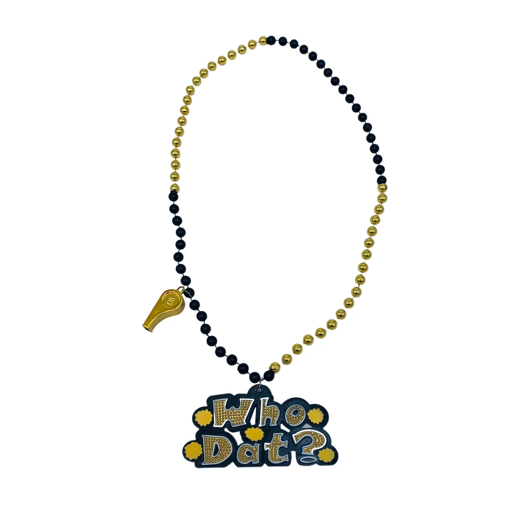 36″ 10mm 4-Section Black and Gold Bead with Whistle and Who Dat Medallion (Each)