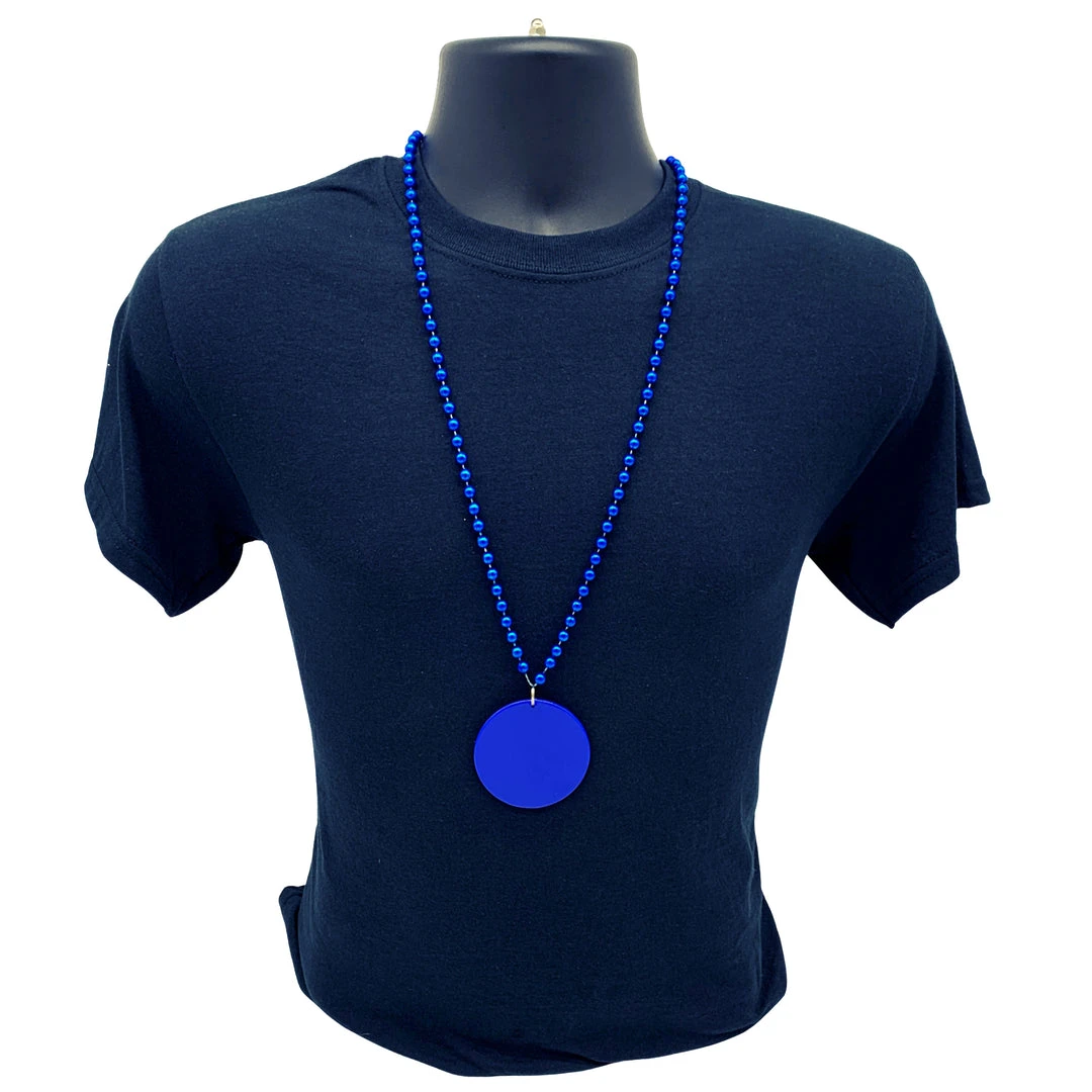 33″ 7mm Metallic Blue Bead Necklace with 2.5″ Blue Disc (Each)