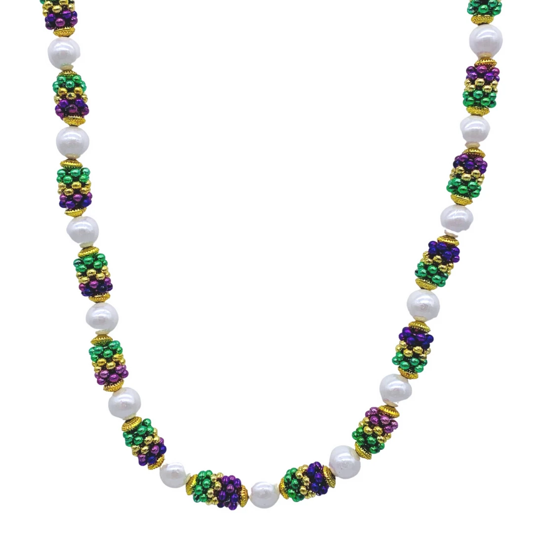 42″ Purple, Green and Gold with White Pearl Mardi Gras Bead (Dozen)